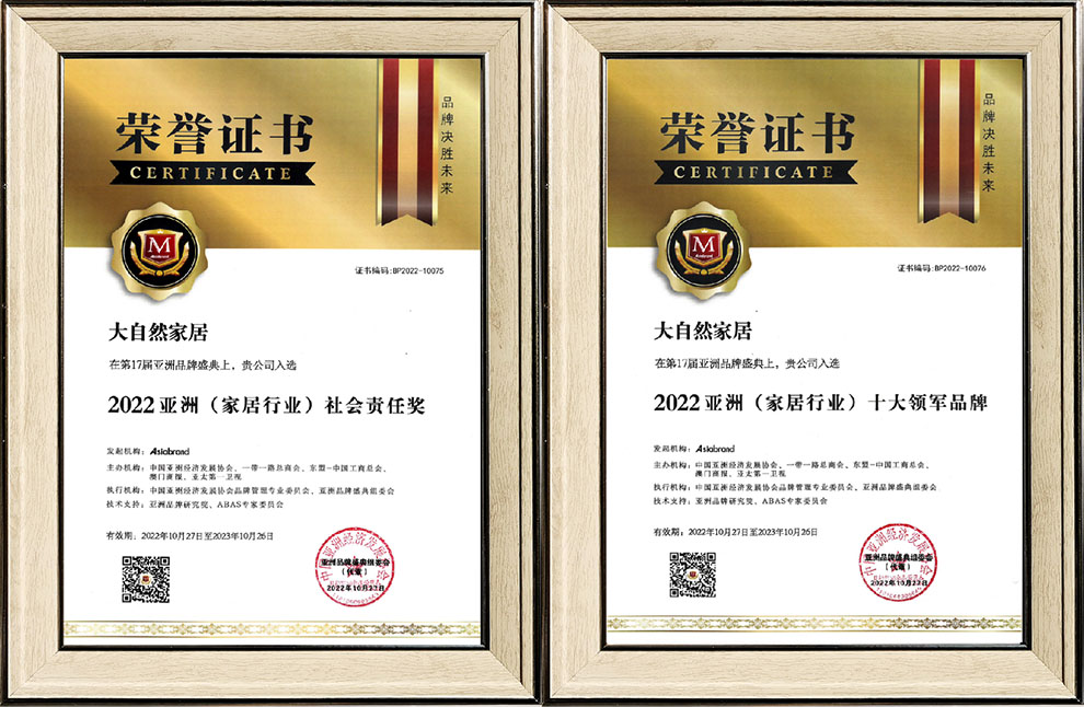 今年大自然家居品牌價(jià)值達(dá)到840.55億元,比去年增加73.68億元,同時(shí)榮獲“2022亞洲(家居行業(yè))社會(huì)責(zé)任獎(jiǎng)”和“2022亞洲(家居行業(yè))十大領(lǐng)軍品牌”兩個(gè)獎(jiǎng)項(xiàng),以自信之態(tài)向世界傳達(dá)出建設(shè)綠色人居的美好構(gòu)想。
