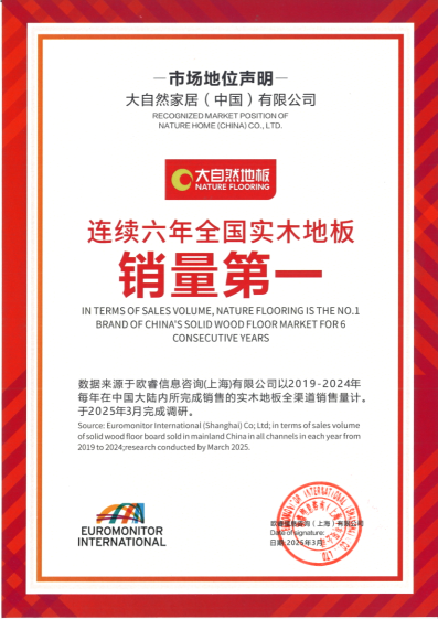 歐睿咨詢作為全球領(lǐng)先的權(quán)威市場調(diào)研機構(gòu),其數(shù)據(jù)以高度公信力享譽行業(yè)。據(jù)歐睿最新數(shù)據(jù)顯示,大自然家居實木地板連續(xù)六年穩(wěn)居“全國實木地板銷量第一”。這一成績,是大自然家居強大的產(chǎn)品力與市場競爭力的表現(xiàn),更印證其在消費者心中的卓越口碑。